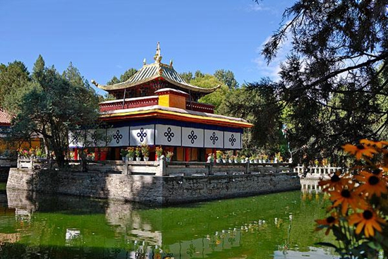 寺院建筑集中了藏族人民在长期实践中所创造和积累的工程技术和文化艺术的精华。藏族寺院在选址、建筑结构、材料、装饰等方面都独具特色。寺院既是宗教活动中心,也是文化的传播场所,在战争中又往往是攻防的军事堡垒。为了取得居高临下的战略优势,寺址一般都选择依山面水向阳的缓坡地或陡峭的山谷之中。藏族大型寺院的建筑群是由"措钦"(集会殿)、"扎仓"(学院)、'唯康"(佛殿)、"康村"(基层组织)、"喇让"(活佛公署),以及印经院、讲经坛、僧舍、转经廊、塔等建筑组成。措钦、北仓、拉康是寺院建筑群的主体,在造型艺术、工程质量上要求较高。措钦和扎仓的大门前常设立一对高耸入云的"塔钦"(大经幡),旗杆上饰以经幡、牦牛尾,顶部为镏金宝瓶。佛殿内部画栋雕梁,帷幔交织,迷幻的光影色彩造成一种神秘气氛。经堂多为密闭式院落,一般在经堂中央以长柱升起天井,用以采光。外部采用金顶、法轮、宝幢、八宝吉祥等具有浓厚宗教色彩的镭金装饰。这些西藏佛教文化的特有标志,把寺院烘托得更加富丽堂皇。 藏族寺院的主要建筑材料是石头、木材、土料等。结构上一般采用木构架,外面再围以泥土或石头砌筑的厚重墙壁。楼层是用木橡铺板构成,上铺木板或土。屋顶多为平顶,这是西藏传统的屋面构造方法。采用汉式屋顶时多为歇山顶,屋面包以简版瓦型的镏金铜皮。金顶正中和两侧一般饰宝瓶等,檐角上饰摩揭鱼首,金顶下采用内地形式的斗拱承檐。