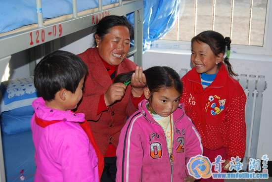 “我校是新建的寄宿制学校,是刚刚起步阶段,困难重重,管理方面不太完善,相信在州、县两级教育部门的大力支持下,能够办好,能够办出特色”校长索南多杰说。索南多杰校长还领我们到学生宿舍和400米塑胶跑道田径场及餐厅。整个餐厅上下两层,比高等学校的餐厅不分上下,不论高年级和低年级同学们在同一时间能吃到可口的饭菜。学生宿舍内被子叠的整整齐齐,洗脸盆、柜子都摆放的错落有致。我们在女生宿舍正好遇见住校生管理值班老师宋英,她正在细心地为几名一年级的女同学整理发辫,同学们偎依在宋老师怀里,就像是在感受妈妈的温暖。宋英老师在基层寄校从事学生管理工作25年,积累了丰富的管理经验,还学会了一口流利的藏语。宋英老师告诉记者,她2008年调到该校工作,负责一到三年级学生的生活,本来考虑着年龄大了要退休,但来到新学校看到老师们那么忙,看到3000多学生的管理需要人手,就悄悄地把退休报告放回了办公桌。她说,在寄校20多年了,已经和这些藏族学生结下了深厚的感情,真有些离不开他们,学生们能够快快乐乐的成长就是我最高兴的。由于学生们年龄小,刚开始生活自理能力很差,值班老师们就手把手地教,吃喝拉撒全得要操心,晚上几个管理人员轮流值班都忙不过来,凌晨三、四点还得叫醒他们上厕所。学生尿床现象时有发生,遇到这种事,她们及时换了干净舒适的床单,为学生们营造如家的温暖。索南多杰校长说每天早晨最忙的就是这些女老师们,光给女同学梳头就要花好长时间,刚开学那几天宋英老师一天早晨给28个女生梳过头。把自己的爱心无私地献给自己热爱的学生,慈母一般关心呵护着学生,为来自农村牧区的藏族学生如家的温暖,像宋英老师这样黙黙无闻乐于奉献的老师在贵德县民族寄宿制学校还有很多很多,为了孩子们美好的明天,他们把自己的职责看的比什么都重要。
