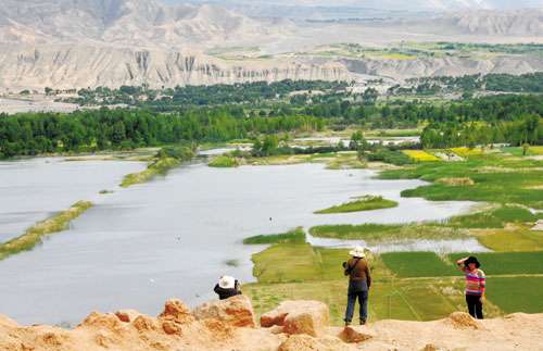 6月15日,游客在景色迷人的国家级黄河湿地公园——千姿湖畔。千姿湖位于我省海南藏族自治州贵德县境内,属于黄河源流域的沼泽湖泊群湿地,旅游区水域面积1.5平方公里,在黄河源头湿地中较为罕见。夏秋季节是观赏千姿湖的最佳时节。(摄影:祁国彪)