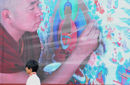 一名群众走过唐卡宣传画墙