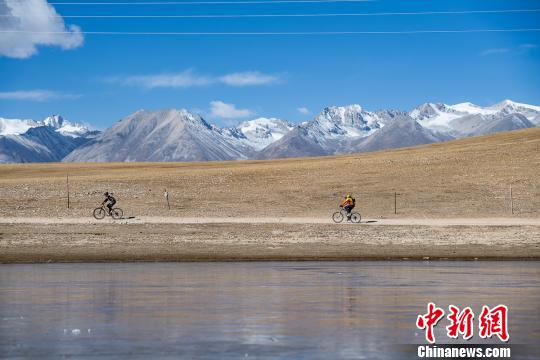 参赛选手骑行途中与高原湖泊、雪山相映成趣