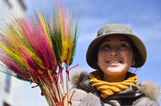 2月19日,出售祈福五谷丰登的五彩青稞。