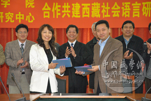 最后,郑堆副总干事和谭贞副院长代表双方签字。中国藏学研究中心原副总干事、著名藏学家胡坦先生及各业务部门负责人参加了签字仪式。