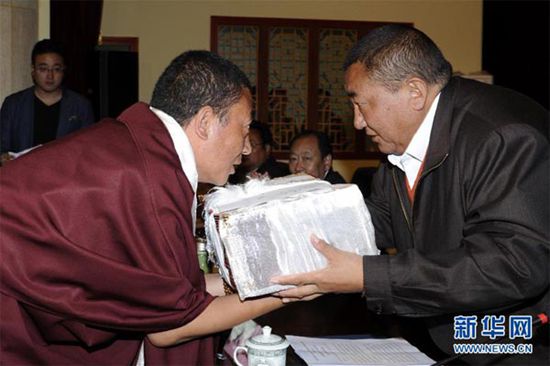 西藏佛学院院长珠康土登克珠(右)给毕业生颁发毕业证