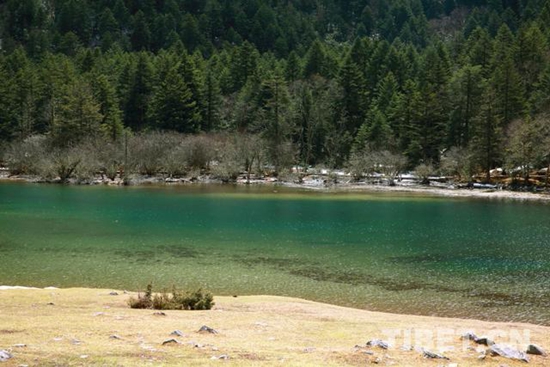 木格措四周围绕着玉树琼枝的山林,经幡飞舞,在积雪的映衬下,神奇而又高洁。