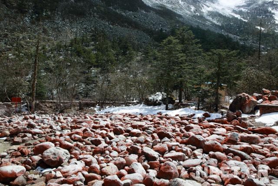 木格措景区内的石头表面有一层红色苔藓,这种红色的石头成了自然景观。